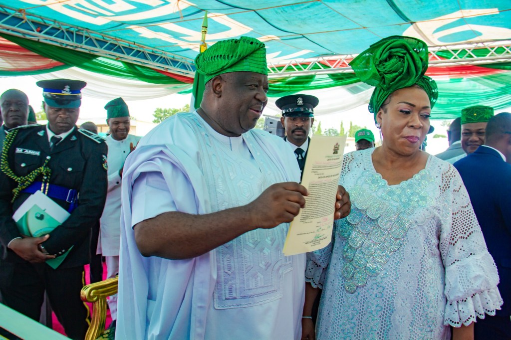 The chief judge of the state Justice David Gwong Mann administered the oath of office on the governor and his deputy at exactly 1. 45 pm which received thunderous ovation from the crowd of people that gathered at the stadium.